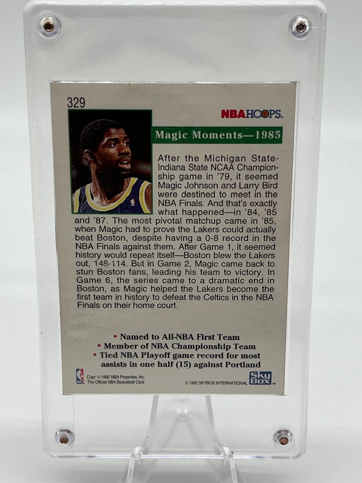 Capture a piece of basketball history with the 1992-93 Hoops #329 Magic Moments 1985 card featuring the legendary Magic Johnson during his iconic era with the Los Angeles Lakers.