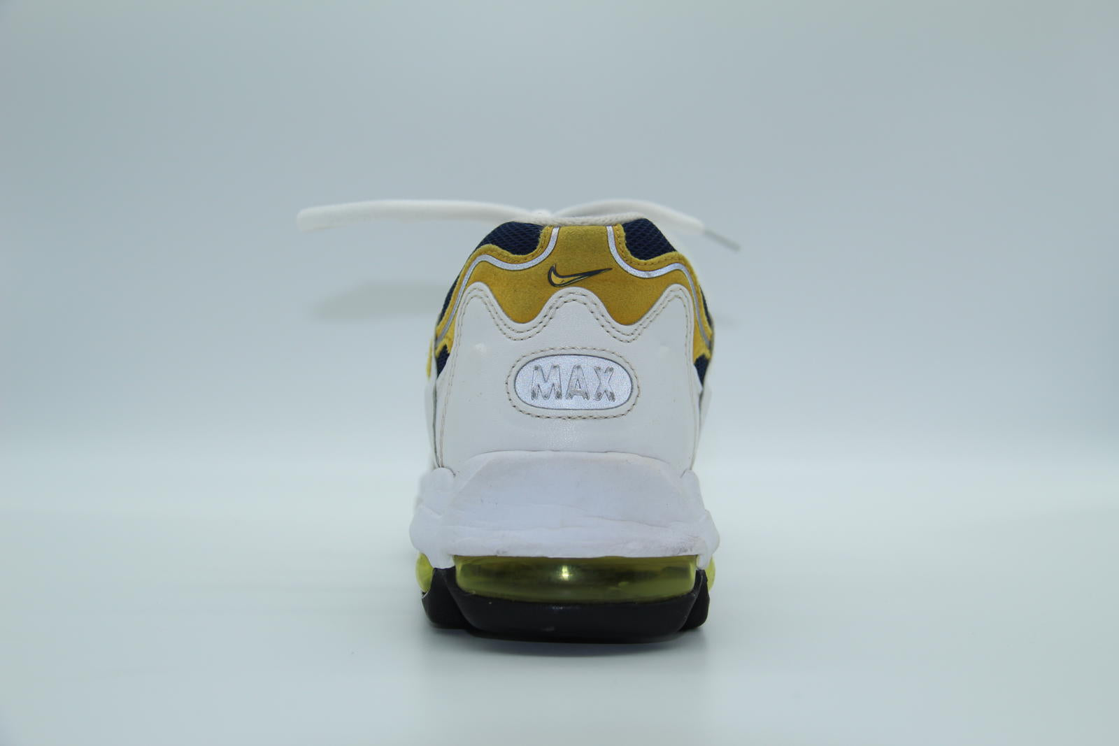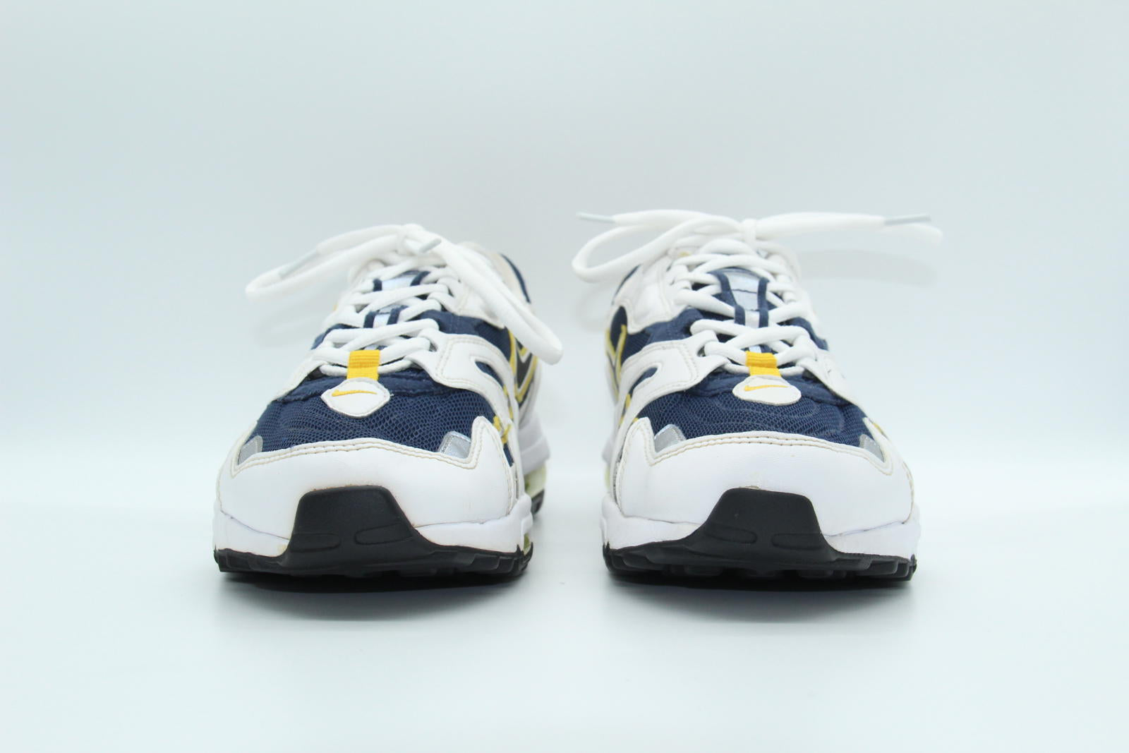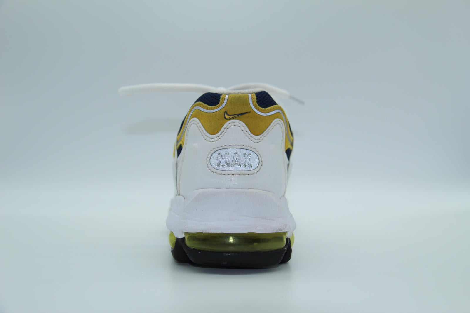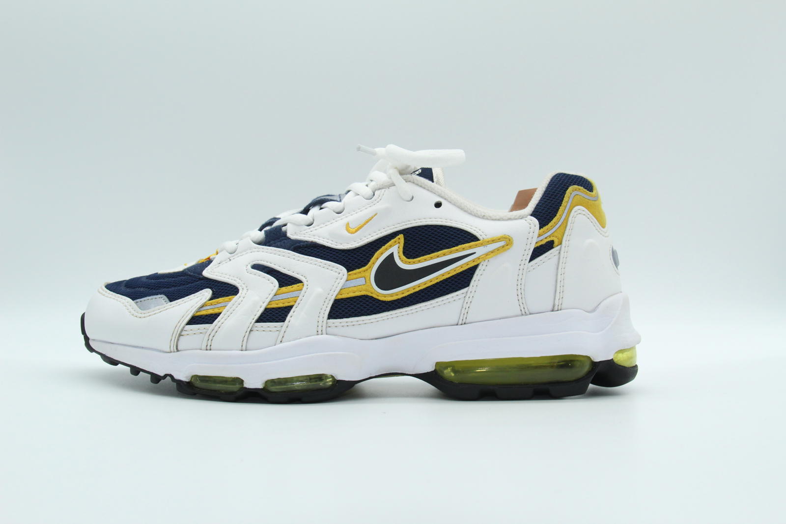 The Nike Air Max 96 II feature a white, black, and 'Midnight Navy' colour combination. First, the pair features navy mesh on the upper while white leather adorns the overlays. Following a 'Golden Yellow' around the Swoosh, running across the sides, and tongue branding. Finishing the look, white colour appears on the midsole and black on the rubber outsole.