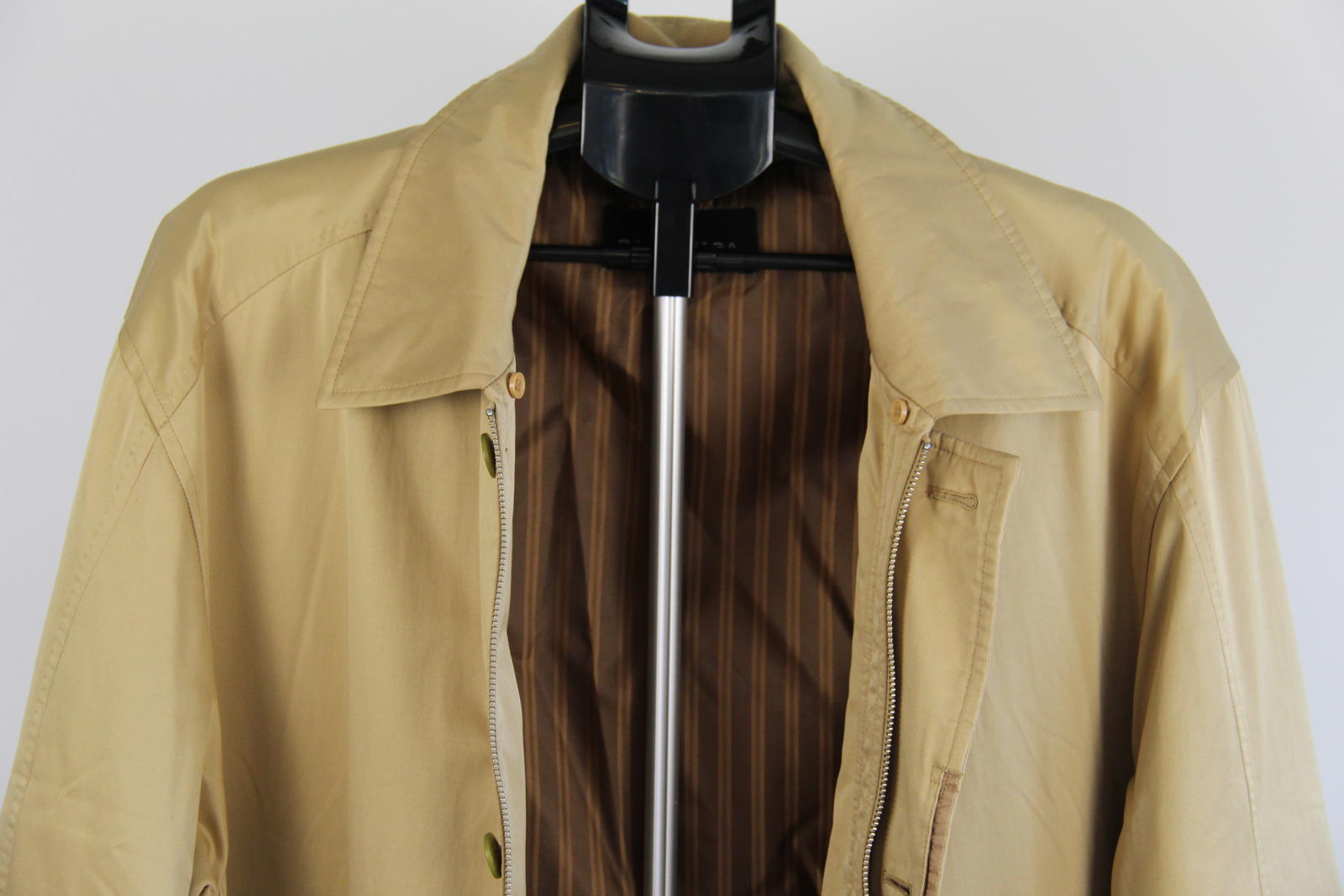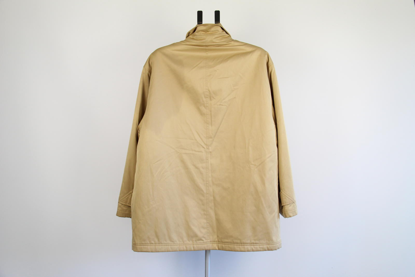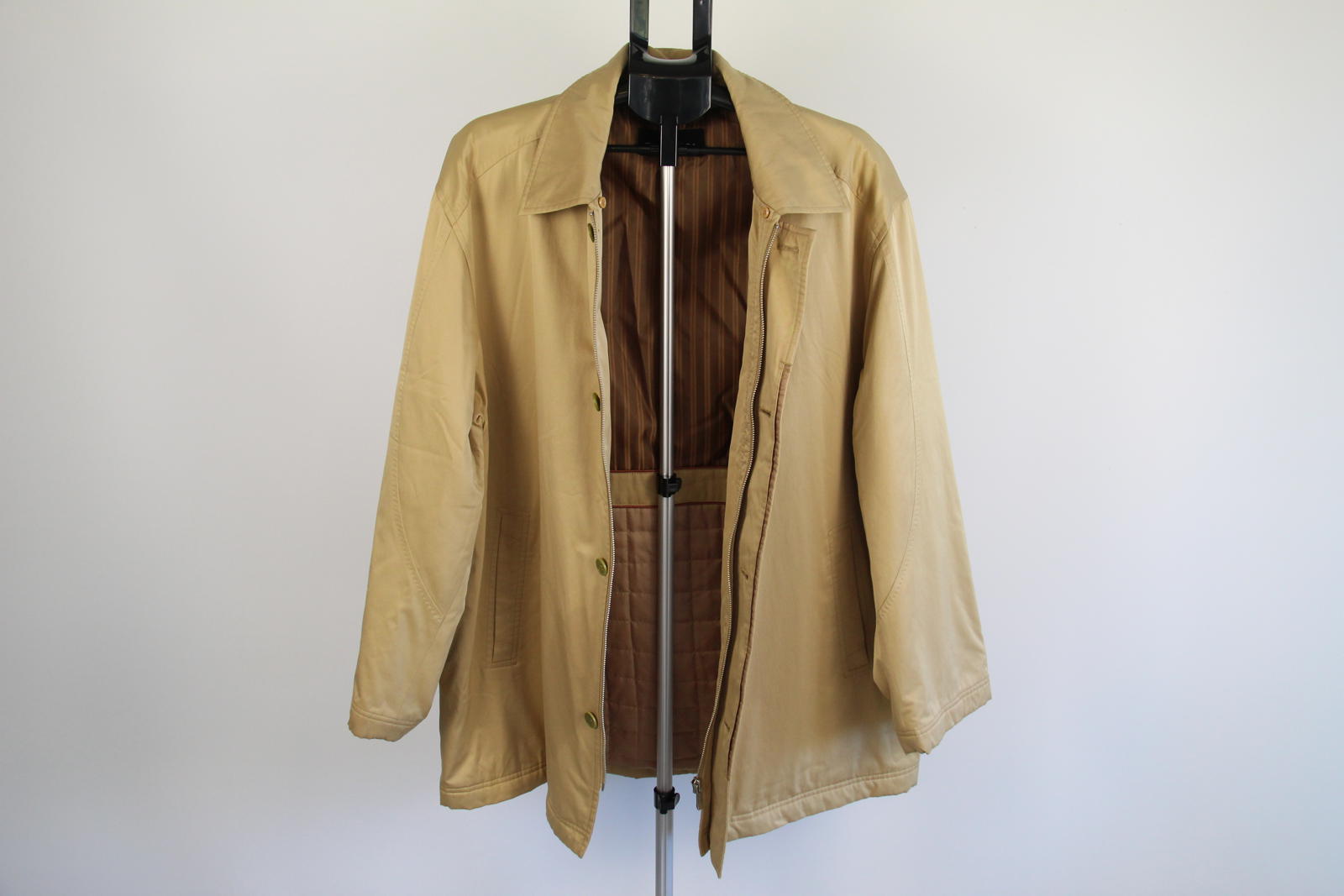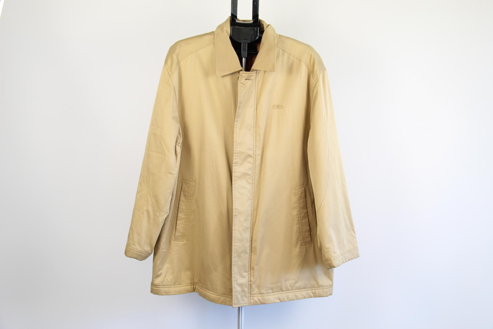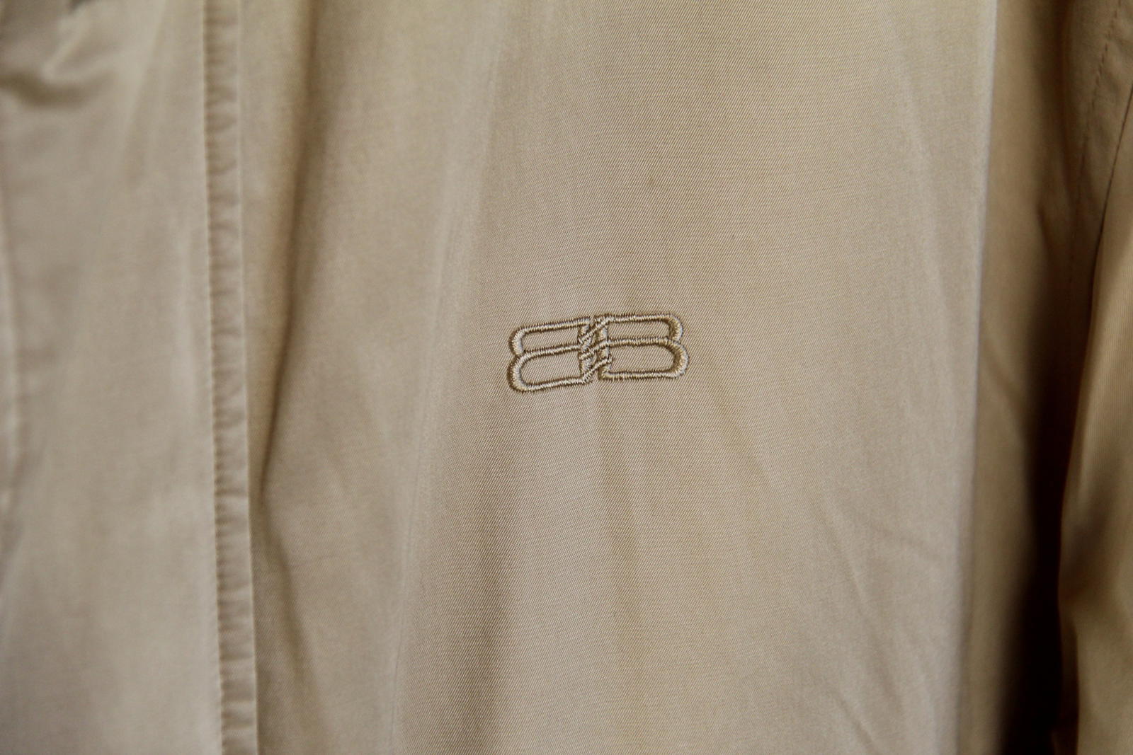 Stay warm in luxury with this classic beige Balenciaga jacket featuring a subtle BB logo on the chest and a striped inner lining. Comes with a detachable collar and quilted lining for added warmth. Made from a durable cotton/polyester shell with 100% polyester inner and padding. Zip and snap front closure, two external hand pockets, and an internal zip pocket.