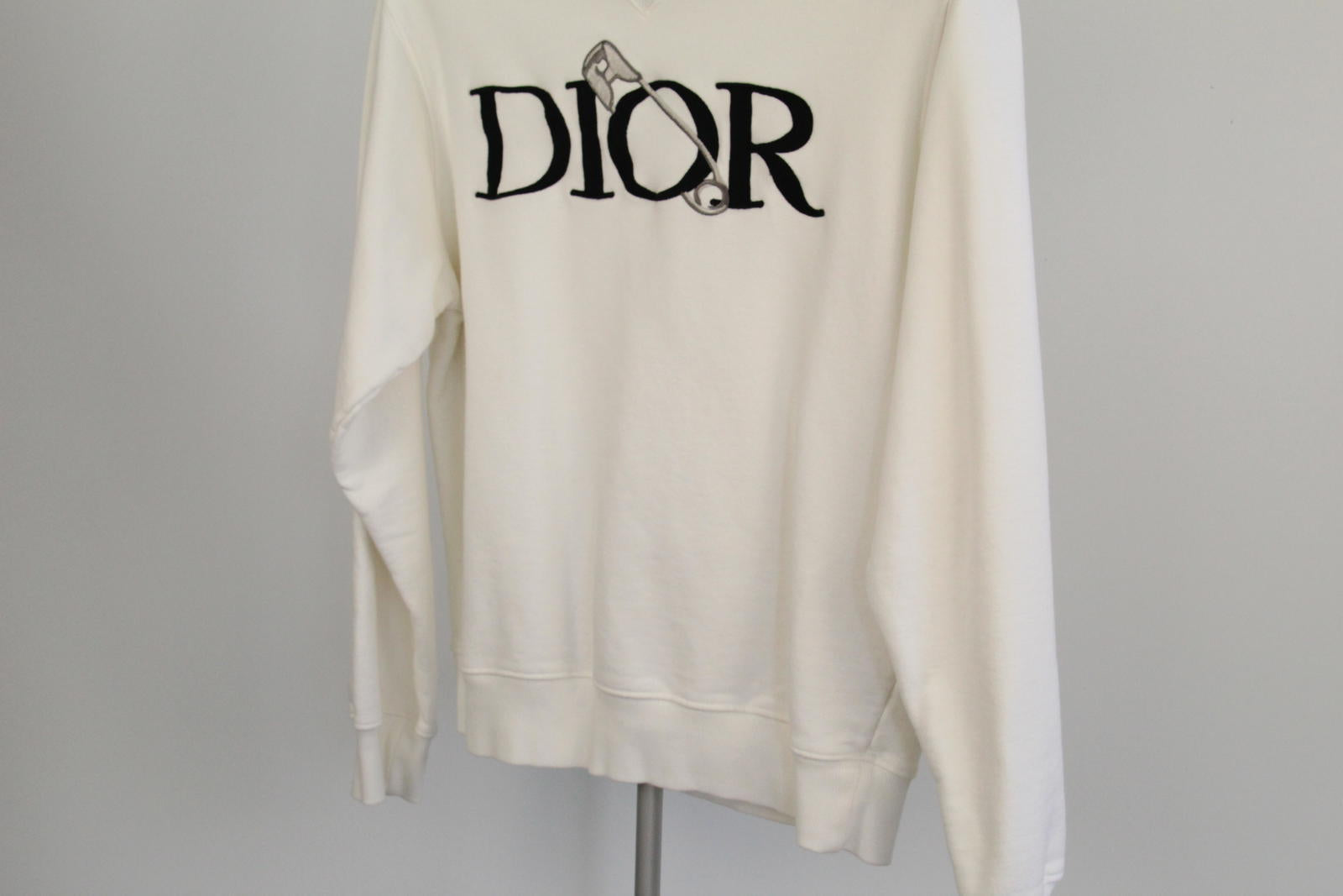 Elevate your wardrobe with this chic Dior Graphic Sweatshirt in a soft cream shade. Perfect for casual outings or lounging at home, this sweater features a bold black Dior logo complemented by a distinctive safety pin graphic, adding a modern twist to a classic design. Crafted with comfort in mind, it boasts a relaxed fit and ribbed cuffs for a snug feel. A must-have for any fashion-forward individual. Ideal for layering or as a standalone statement piece.