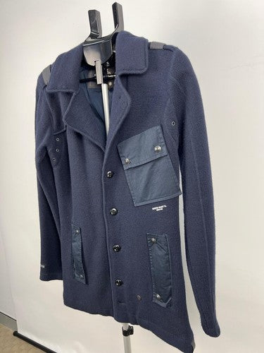 Textured knit field jacket by G-Star RAW in deep navy, featuring contrast woven utility pockets and shoulder epaulettes. A tailored silhouette with notched lapel, button front and full lining gives a rugged, military-inspired look. Size S as shown on the inner label.