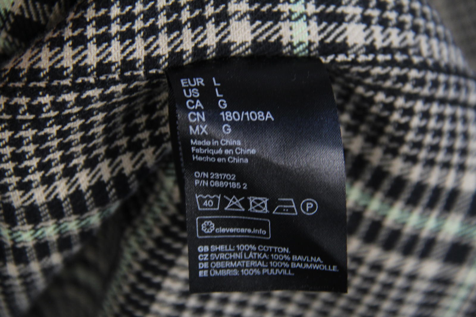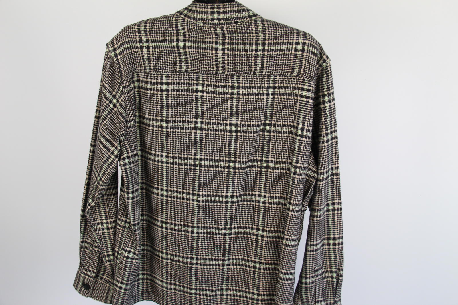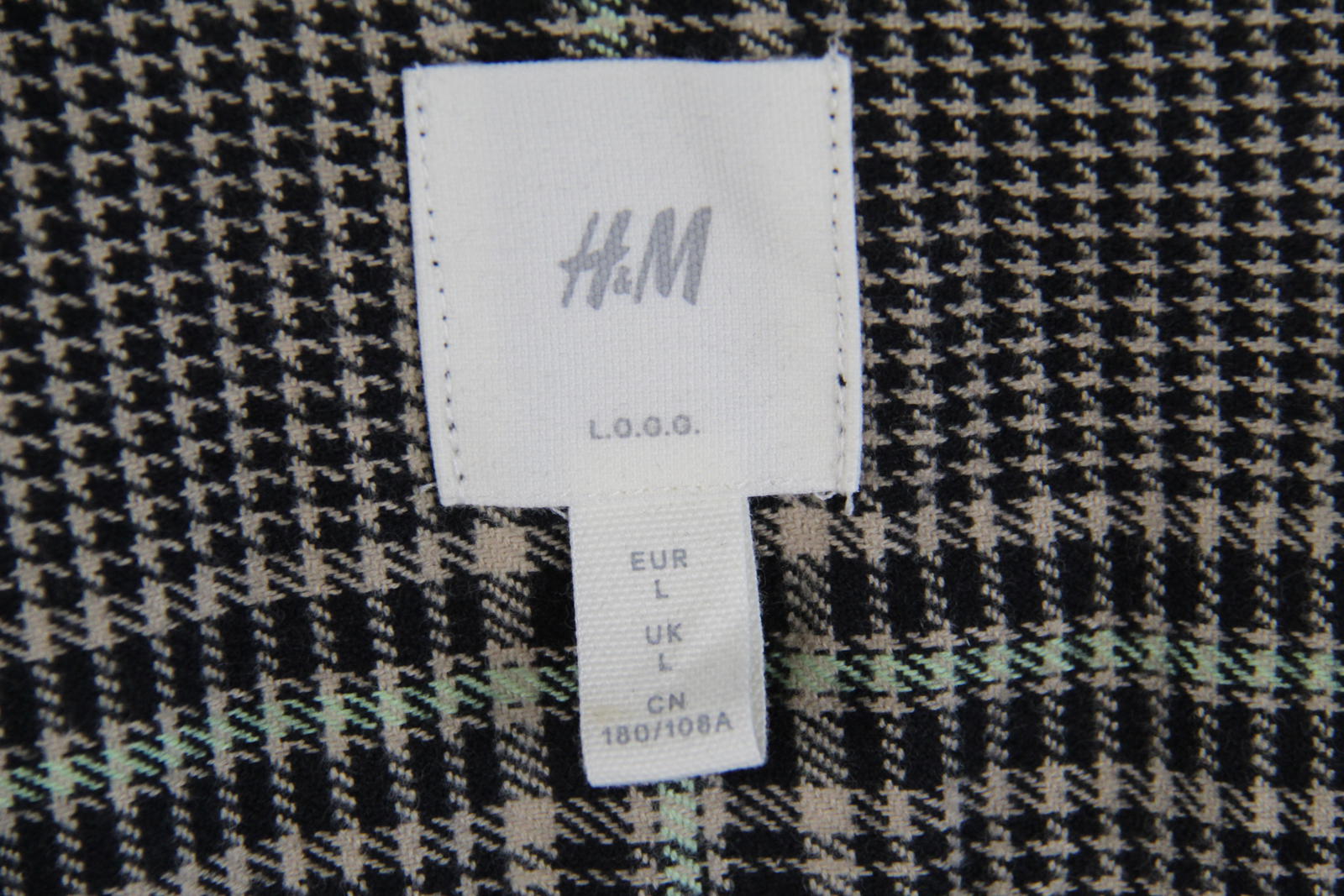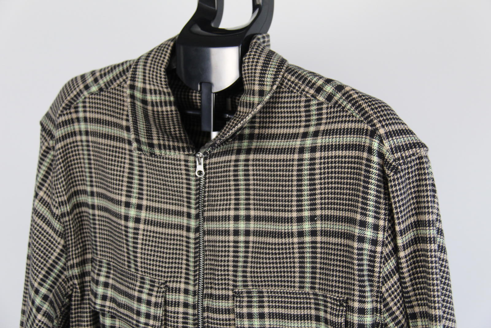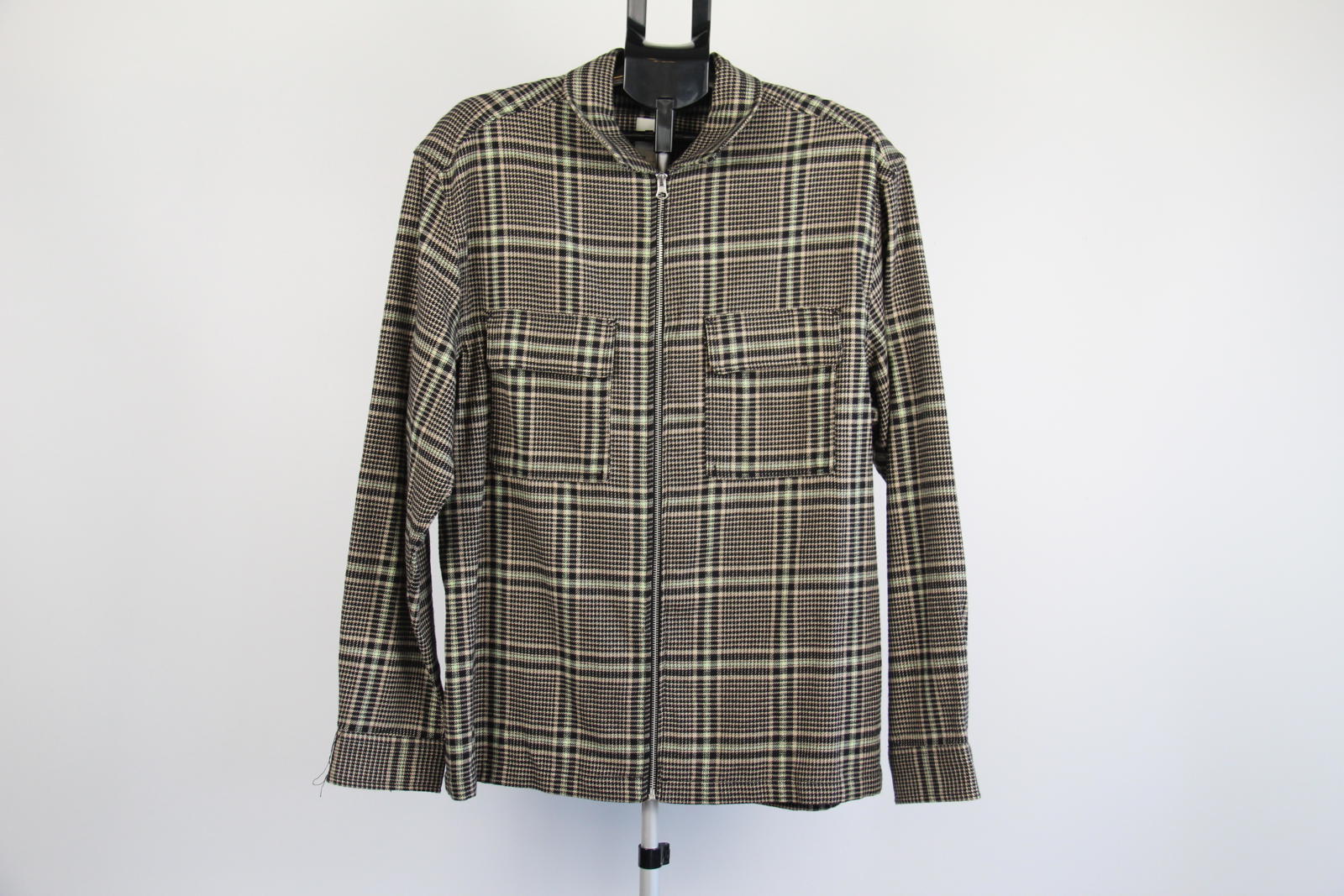 Classic and versatile men's overshirt from H&M's L.O.G.G. (Label of Graded Goods) line, featuring a stylish black, beige, and light green houndstooth check pattern. Designed in a shirt-style cut with a full front zip closure and dual chest flap pockets. Perfect as a light outer layer in autumn or for layering in cooler months.