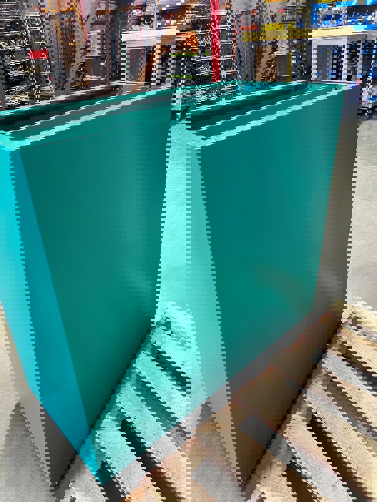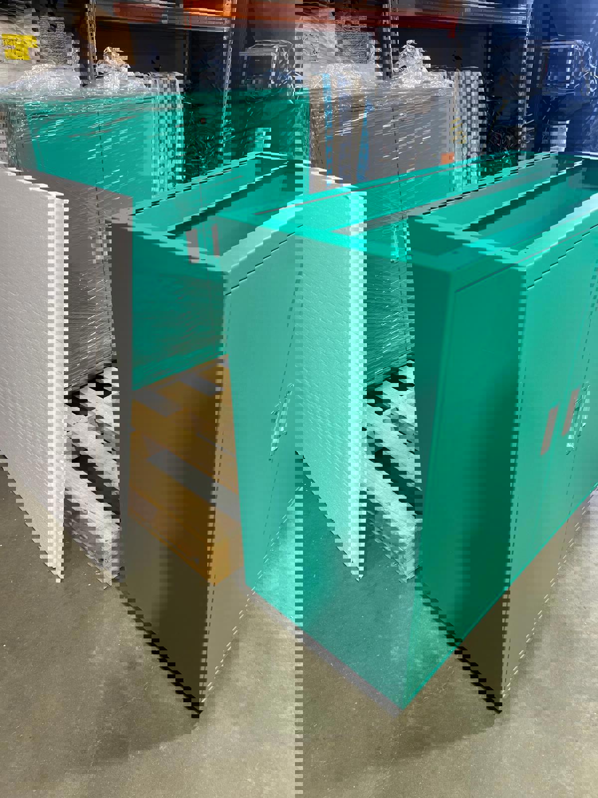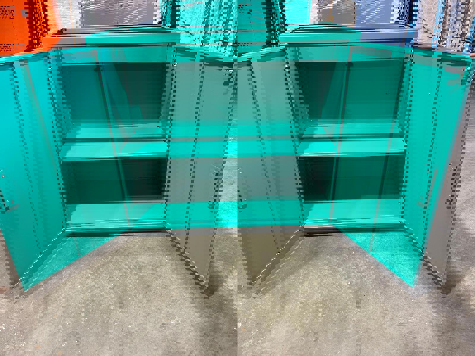 These industrial-grade green steel cabinets are perfect for workshops, warehouses, or garage setups. Both units feature lockable double doors with integrated handles and keys included for secure storage. One unit comes fitted with a height-adjustable shelf, the other one doesn't have a shelf.