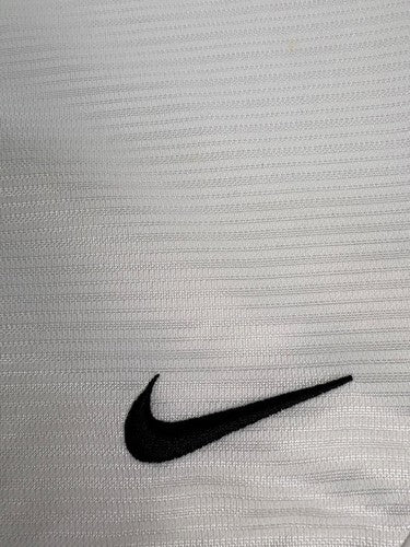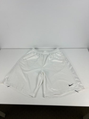 Lightweight white athletic shorts by Nike featuring a breathable mesh knit with subtle rib texture and black Swoosh logo at the hem. Elastic waistband provides an easy, relaxed fit; contrast black piping runs down the sides for a sporty look.
