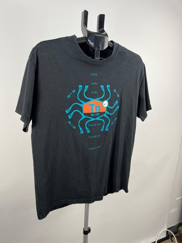 Black short-sleeve crew neck T-shirt featuring a bold Nike “Tn Air / Tuned Air” graphic in teal and orange across the chest. Classic relaxed fit with printed neck label indicating size S.