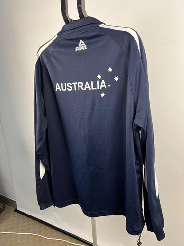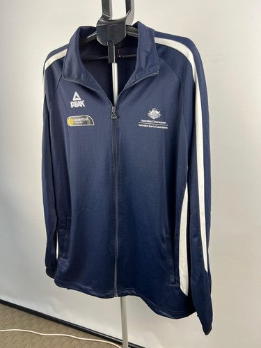 Official Basketball Australia track jacket by Peak in size 3XL. Navy blue poly blend with white shoulder stripes and chest logos for PEAK, Basketball Australia and the Australian Sports Commission; bold “AUSTRALIA” and Southern Cross print on the back. Full-zip front with stand collar and front pockets for a classic warm‑up look.
