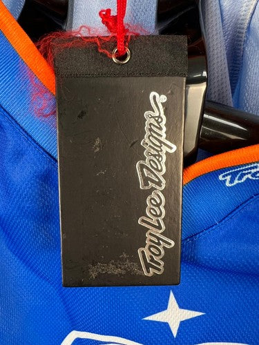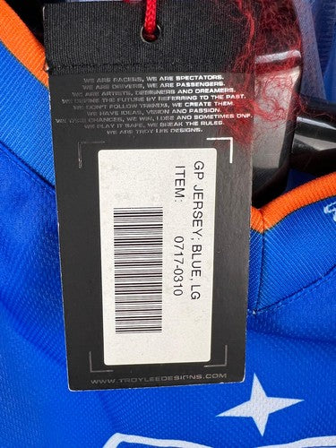 Bold blue and white Troy Lee Designs GP motocross jersey in size Large with orange trim and striking TLD logos on the chest, back and sleeves. Lightweight breathable polyester mesh with a V‑neck and long sleeves for comfortable coverage on the bike.