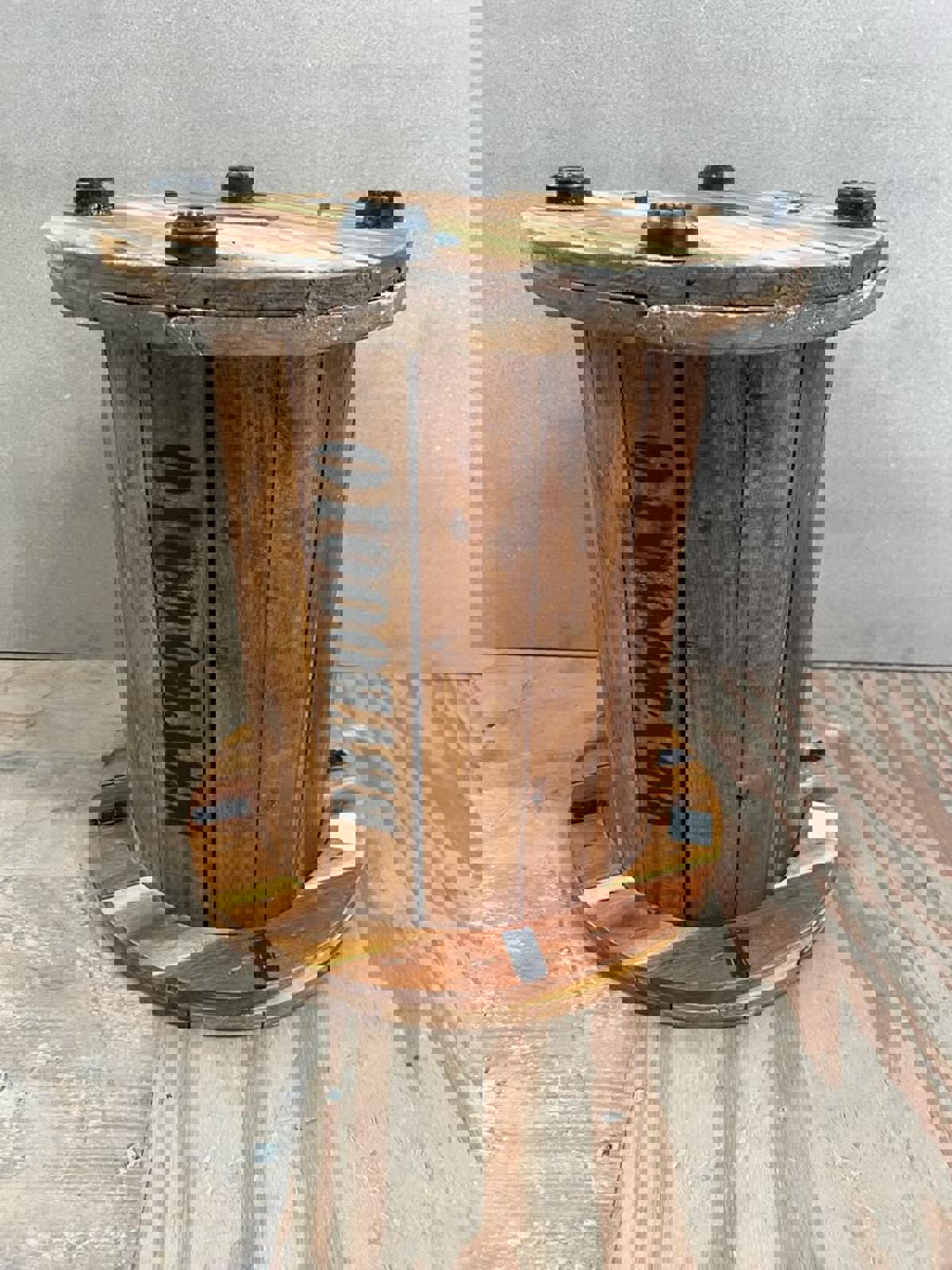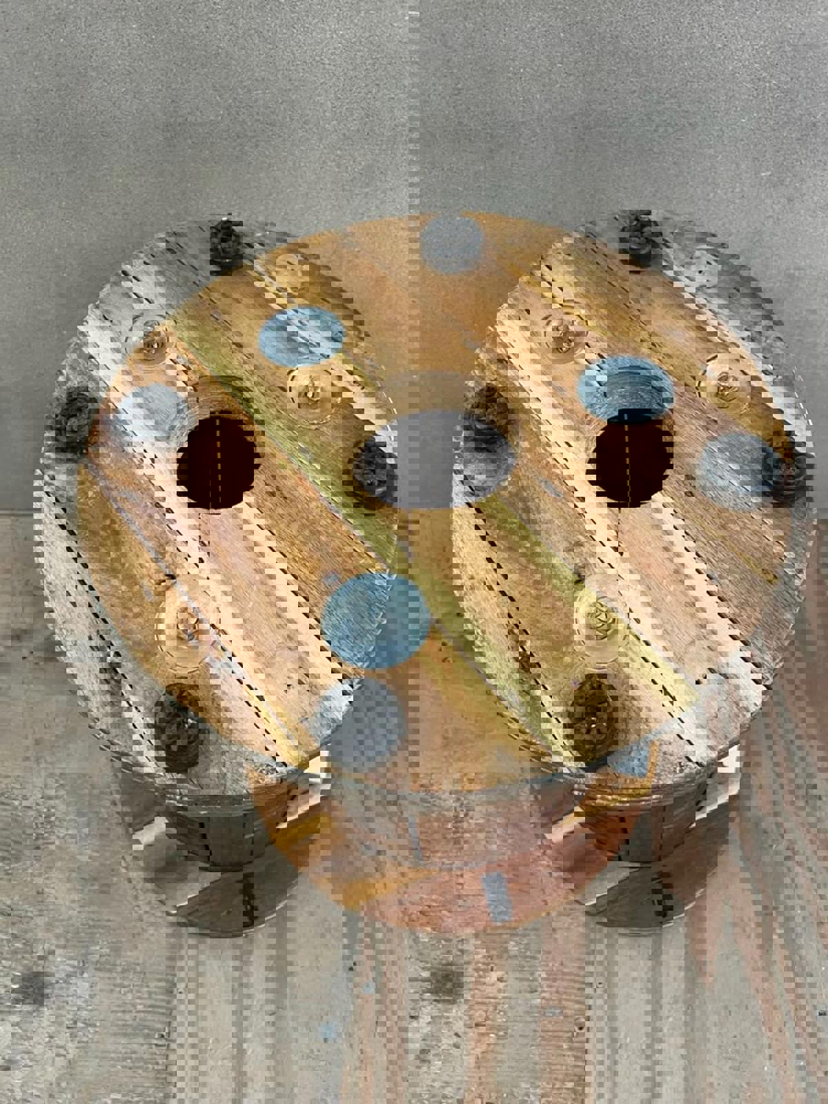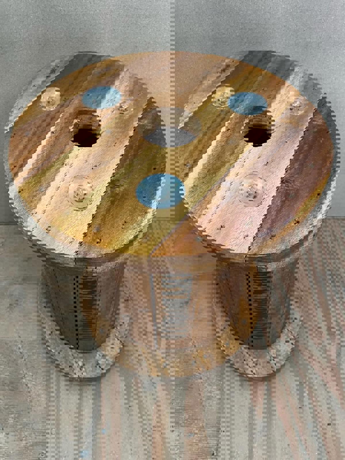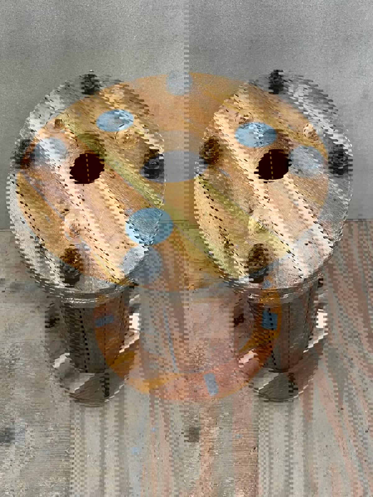 One-of-a-kind upcycled industrial stool or side table made from a reclaimed timber cable spool.